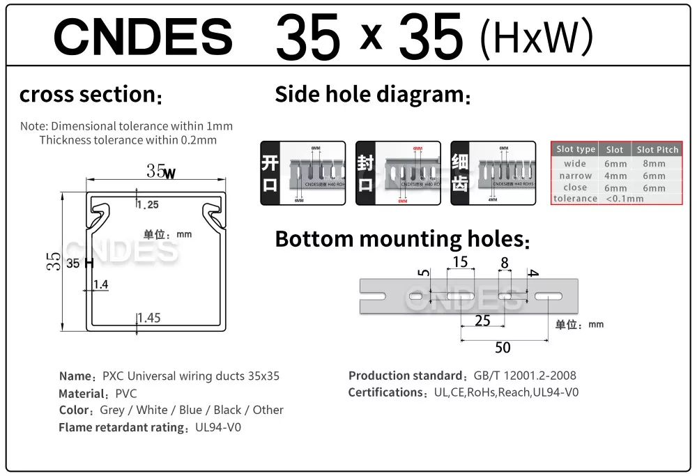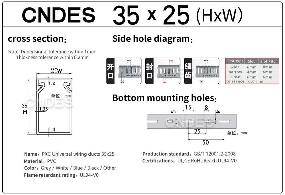 A kínai CNDES cég által gyártott, testreszabott, 35 mm magasságú hornyolt PVC huzalvezető csatorna egy merev PVC alapból és egy levehető burkolatból áll. Az alapon egyenlő távolságra lévő ujjszerű hornyok találhatók mindkét oldalon, amelyek "fésűs fogakat" alkotnak. Ezeket a fogakat kézzel el lehet törni, így a vezeték bármilyen pozícióból vízszintesen kiléphet. A burkolat könnyen visszapattan a helyére, megőrizve szép megjelenését. Az alján található rögzítőfuratok sora megfelel a DIN 43659 szabvány szerinti távolságnak. Gyorsan rögzíthető panelekhez, szekrénykeretekhez vagy hasonló szerkezetekhez M5-ös csavarokkal vagy szegecsekkel.