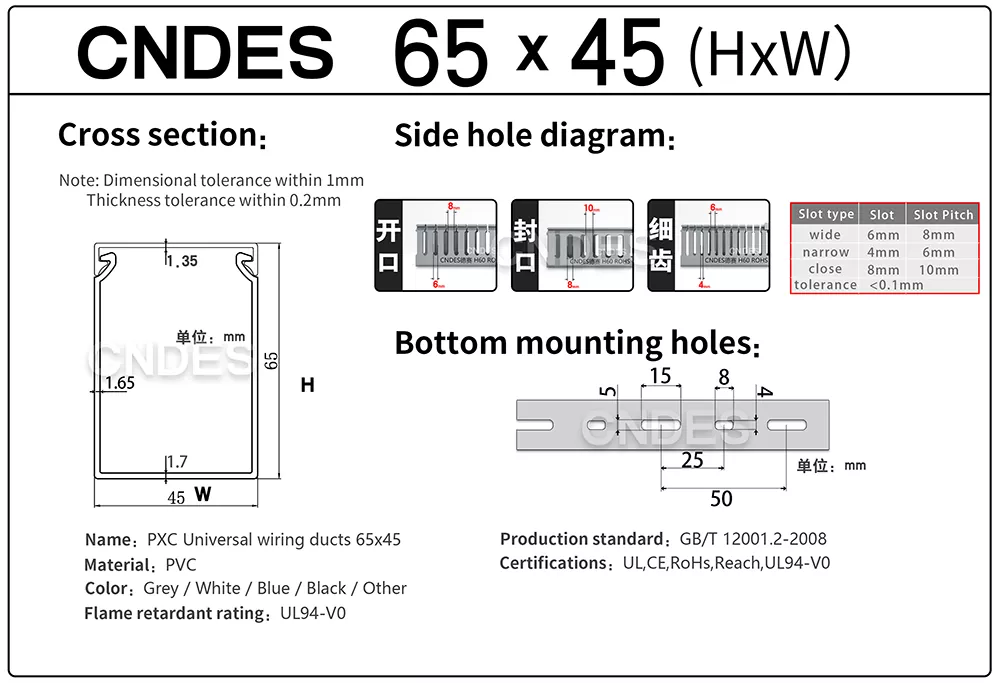 Ha testreszabott 65 × 45 szürke hornyos PVC vezetékcsatornákat vásárol egy megbízható kínai gyártótól és beszállítótól, a CNDES állandó minőséget, rugalmas testreszabást és professzionális szolgáltatást kínál.