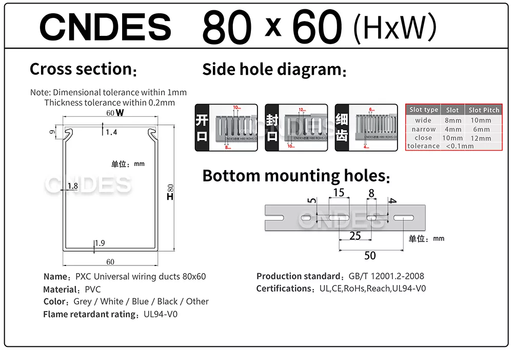 4. Az UL 80 × 60 listán szereplő hornyolt PVC vezetékcsatornánk teljes mértékben megfelel az UL, CE, RoHS és REACH tanúsítási szabványoknak, így világszerte ideális projektekhez.