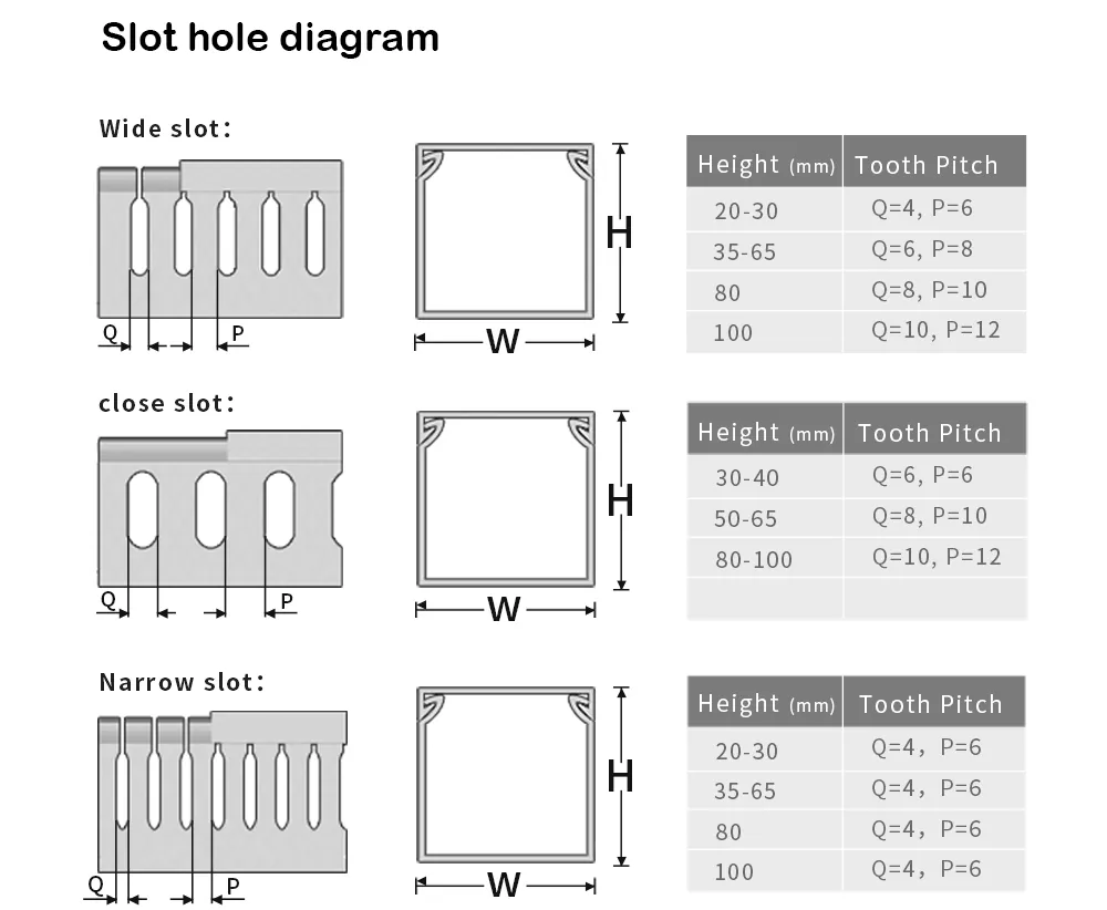 A kábeltálca specifikációi magasság * szélességben vannak kifejezve, a mértékegység pedig mm. Először határozza meg a kábeltálca szükséges méretét, például 80 mm magas és 40 mm széles. Ezután válassza ki a kimeneti furat szélességét a vezeték vastagsága alapján, legyen az széles fogak (8 mm) vagy a finom fogak (4 mm). Javasoljuk, hogy a tényleges kábel a tálca területének legfeljebb 70%-át foglalja el.